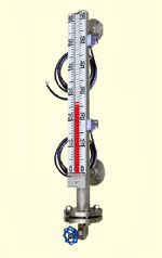 控制型是在翻柱液位計的基礎(chǔ)上增加了磁控開關(guān),在監(jiān)測液位的同時磁控開關(guān)信號可用于對液位進(jìn)行控制或報警;遠(yuǎn)傳型是在翻柱液位計的基礎(chǔ)上增加了 4~20mA 變送傳感器,在現(xiàn)場監(jiān)測液位的同時將液位的變化通過變送傳感器、線纜及儀表傳到控制室,實現(xiàn)遠(yuǎn)程監(jiān)測和控制。