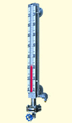 在您選用此產(chǎn)品前我們先將磁性翻柱液位計(jì)的工作原理作一簡單的介紹。它有一容納浮球的腔體我們稱其為主體管或外殼,它通過法蘭或其他接口與容器組成一個(gè)連通器;這樣它腔體內(nèi)的液面與容器內(nèi)的液面是相同高度的,所以腔體內(nèi)的浮球會(huì)隨著容器內(nèi)液面的升降而升降;這時(shí)候我們并不能看到液位,所以我們?cè)谇惑w的外面裝了一個(gè)翻柱顯示器,因?yàn)槲覀冊(cè)谥圃旄∏驎r(shí)在浮球沉入液體與浮出部分的交界處安裝了磁鋼,它與浮球隨液面升降時(shí),它的磁性透過外殼傳遞給翻柱顯示器,推動(dòng)磁翻柱翻轉(zhuǎn)180°;由于磁翻柱是有紅、白兩個(gè)半圓柱合成的圓柱體,所以翻轉(zhuǎn)180°后朝向翻柱顯示器外的會(huì)改變顏色(液面以下紅色、以上白色),兩色交界處即是液面的高度。