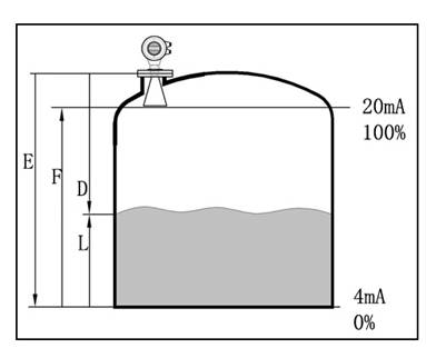 通過輸入空罐高度E(=零點),滿罐高度F(=滿量程)及一些應(yīng)用參數(shù)來設(shè)定,應(yīng)用參數(shù)將自動使儀表適應(yīng)測量環(huán)境。對應(yīng)于4-20mA輸出。