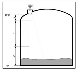 - 若介質(zhì)為低介電常數(shù)當(dāng)其處于低液位時,罐低可見,此時為保證測量精度,建議將零點定在低高度為C 的位置。