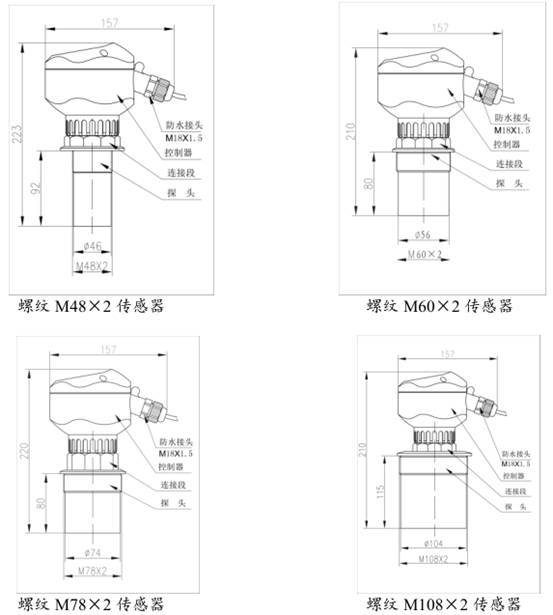 SKCYW系列超聲波液位計 ; SKCYW系列超聲波液位計是由微處理器控制的數(shù)字液位儀表。在測量中脈沖超聲波由傳感器發(fā)出,聲波經(jīng)液體表面反射后被同一傳感器接收并轉換成電信號。超聲波液位計具有自動功率調整,溫度補償,抗干擾等功能。由于采用非接觸測量,被測介質幾乎不受控制,可廣泛應用于水環(huán)境、酸堿、泥漿、食品等多種環(huán)境。 1、測量流量、液位、低表壓、真空和比重 2、兩線制最大量程可達30m 3、四線制最大量程可達40m 4、最小分辨率1mm 5、LCD/LED大顯示屏 6、智能信號處理技術 7、配有高低位雙繼電器(僅四線制) 8、全塑料防腐外殼(防護等級lP67) 9、換能器結構(小量程物位計法蘭安裝時,對法蘭接管長度無要求) 10、簡單的按鍵設定參數(shù)(無需等待容器排空或加滿,無需附加的遙控器) 11、靈活的安裝方式(螺紋/法蘭、固定孔/支架) 螺紋尺寸:M48*2 M60*2 超聲波液位計技術參數(shù)