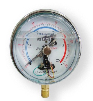 在電接點(diǎn)壓力表裝置的電接觸信號(hào)針上,裝有可調(diào)節(jié)的永久磁鋼,可以增加接點(diǎn)吸力,加快接觸動(dòng)作,從而使觸點(diǎn)接觸可靠,消除電弧,能有效的避免儀表由于工作環(huán)境振動(dòng)或介質(zhì)壓力脈動(dòng)造成觸點(diǎn)的頻繁關(guān)斷。所以電接點(diǎn)壓力表具有動(dòng)作可靠、使用壽命長(zhǎng)、觸點(diǎn)開關(guān)功率較大等優(yōu)點(diǎn)。